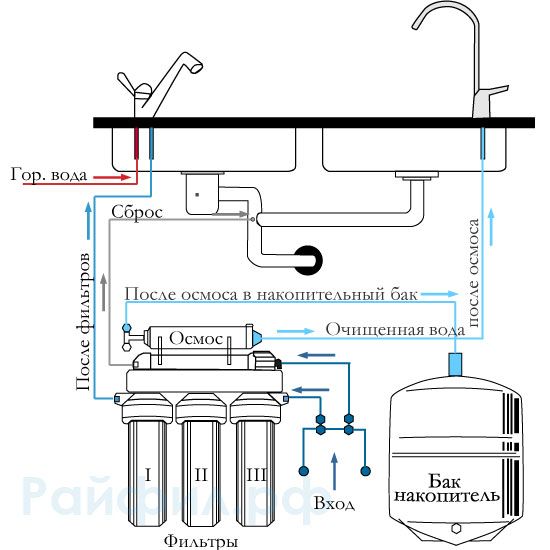 Для обеспечения производительности, давление в водопроводе должно быть не менее 3 атмосфер. Иначе вода не будет «продавливаться» через обратноосмотическую мембрану, процесс очистки пройдет не корректно, и вся вода просто будет сливаться в канализацию.